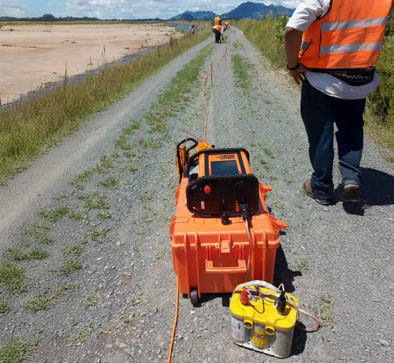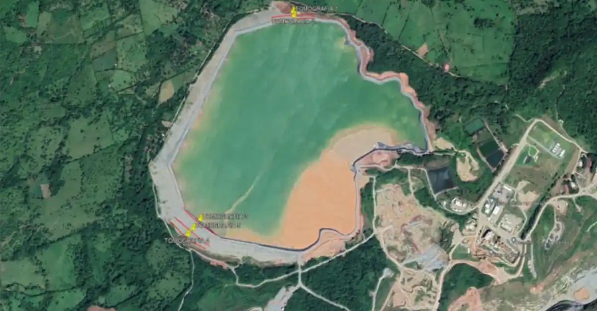SINERGIA SA realizó una tomografía geoeléctrica 2D en la Presa de Colas La Esperanza para identificar zonas saturadas y evaluar posibles filtraciones hacia el talud. Se ejecutaron cinco perfiles de 235 metros, permitiendo diferenciar unidades de material fino, gravas compactas y áreas de baja resistividad asociadas a humedad. Los resultados revelan líneas de flujo superficiales y estratos con saturación localizada que orientan las recomendaciones de verificación y control.